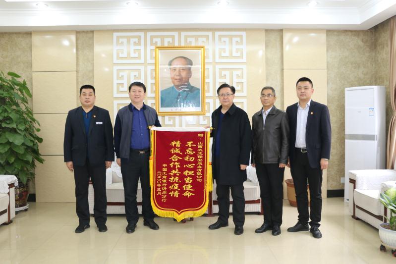 趙培宏代表公司感謝工行忻州分行對我方守押工作的肯定,表示為客戶單位提供優(yōu)質(zhì)服務(wù)是公司職責(zé)所在,工行忻州分行贈送錦旗,極大地鼓舞了公司干部員工的工作熱情。今后,公司將進(jìn)一步提升服務(wù)意識和服務(wù)質(zhì)量,用實(shí)際行動來踐行責(zé)任與擔(dān)當(dāng),以更優(yōu)質(zhì)的服務(wù)、更專業(yè)的水平滿足客戶需求,一同抗擊疫情,更好的為忻州經(jīng)濟(jì)社會建設(shè)服務(wù)。