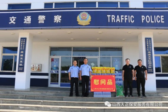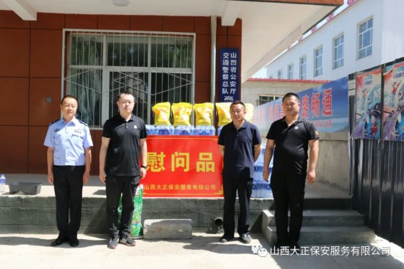 6月3日,山西大正保安服務(wù)(集團(tuán))有限公司河曲中隊(duì)代理中隊(duì)長(zhǎng)霍健,帶領(lǐng)中隊(duì)隊(duì)員代表公司慰問(wèn)了河曲縣公安局交通警察大隊(duì),為奮斗在交通指揮一線的縣交警大隊(duì)民警送去防暑降溫慰問(wèn)品。將關(guān)愛(ài)送到一線,把清涼送到一線,確保一線交通干警同志們度過(guò)一個(gè)安全、衛(wèi)生、清涼的夏季。感謝一線交警不畏烈日、日夜堅(jiān)守崗位,確保了城區(qū)干道交通暢通、人民出行安全,營(yíng)造了良好的道路交通環(huán)境。交警大隊(duì)副隊(duì)長(zhǎng)李強(qiáng)接受了慰問(wèn),并表示:“有了企業(yè)的關(guān)愛(ài)及社會(huì)各界的理解和支持,讓交警感受到了無(wú)盡的清涼。全體民輔警將繼續(xù)發(fā)揚(yáng)‘能吃苦、能戰(zhàn)斗、能奉獻(xiàn)’的優(yōu)良作風(fēng),以更加飽滿的工作熱情投入工作中,以實(shí)際行動(dòng)回報(bào)社會(huì)各界的關(guān)愛(ài)。”
