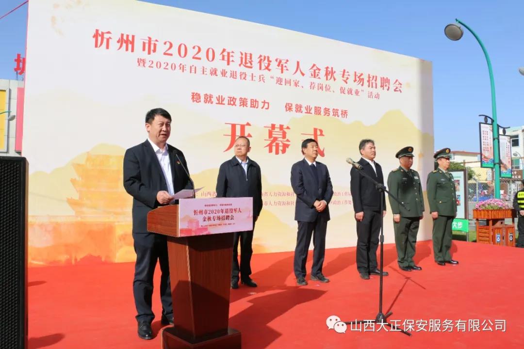 10月21日,由山西省退役軍人事務(wù)廳、山西省人力資源和社會保障廳、山西省軍區(qū)政治工作局主辦,忻州市退役軍人事務(wù)局、忻州市人力資源和社會保障局、山西省忻州軍分區(qū)承辦的忻州市2020年退役軍人金秋專場招聘會于忻州體育廣場舉行,活動以“穩(wěn)就業(yè)政策助力,保就業(yè)服務(wù)筑橋”為主題。山西大正保安服務(wù)集團有限公司總經(jīng)理趙培宏作為參會企業(yè)代表上臺發(fā)言,集團公司人力資源中心工作人員在現(xiàn)場開展招聘活動。