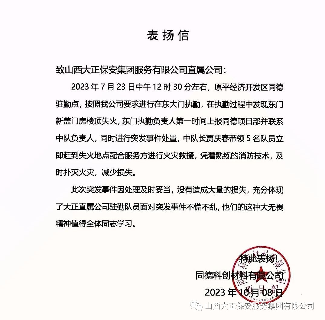 2023年10月8日,山西大正保安服務(wù)集團(tuán)有限公司收到一封來(lái)自原平經(jīng)開區(qū)同德科創(chuàng)材料有限公司的表?yè)P(yáng)信,對(duì)原平經(jīng)開區(qū)同德對(duì)駐勤點(diǎn)全體隊(duì)員的工作提出表?yè)P(yáng)。